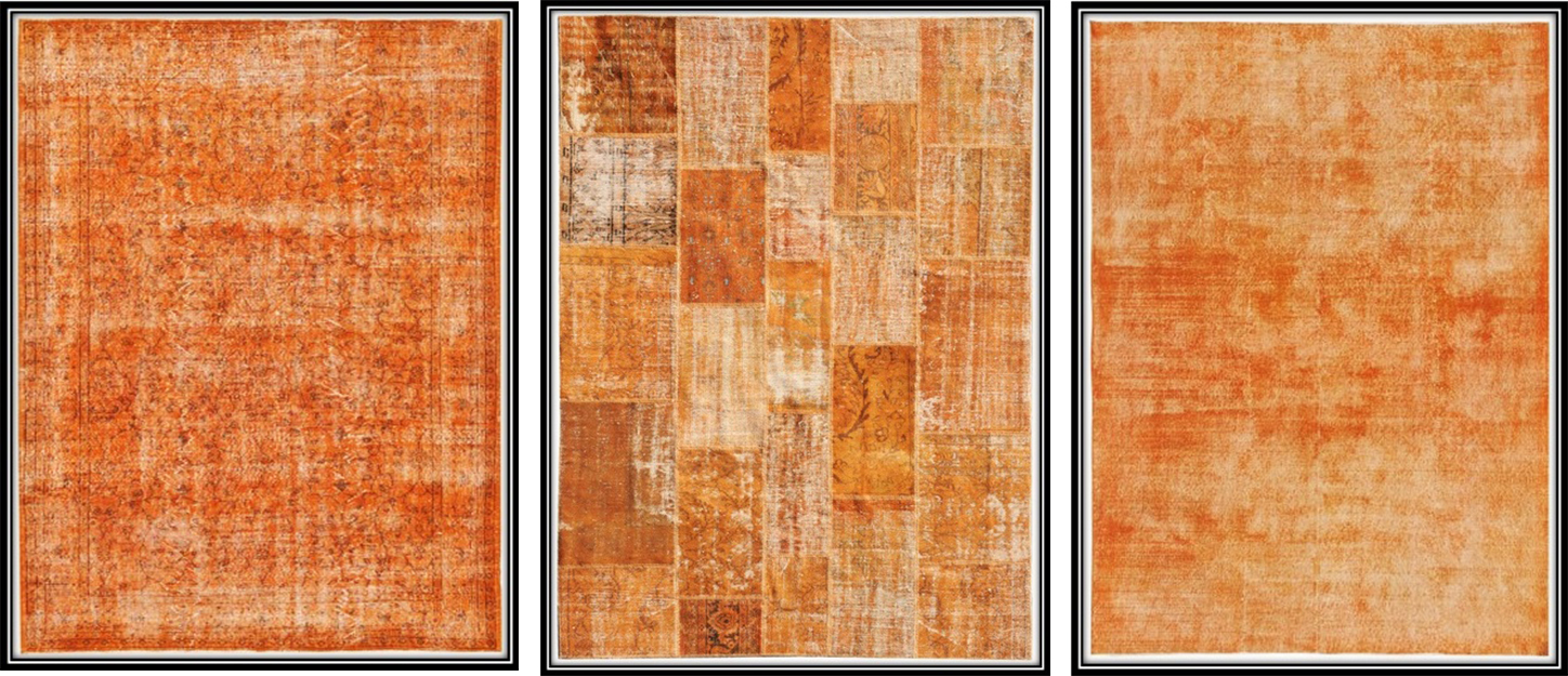 With an orange vintage carpet or orange patchwork carpet you add a needed fresh, energetic vibe to your home while contrasting neutral interiors to uplift its whole mood. Especially in rooms with little natural light, a premium quality orange designer carpet makes a room feel much cosier and inviting. Just as a breath-taking sunset, a warm orange designer carpet sets the stage for a pleasant, relaxing atmosphere you may in this case enjoy whenever entering your home and for many years to come.